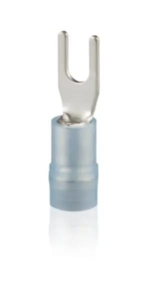 NYLON-INSULATED FORK TERMINAL, DOUBLE CRIMP, LENGTH 21.7MM, WIDTH 9.3MM, DIAMETER 2.3MM, STUD SIZE 5MM, WIRE RANGE 1.5-2.5MM2, COPPER, TIN PLATED, 600V MAX, TEMPERATURE RATING 105 DEGREES CELSIUS, COLOR BLUE