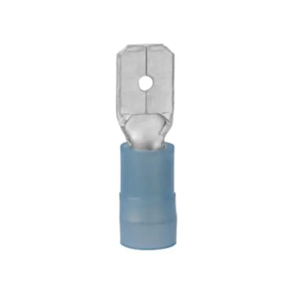 NYLON-INSULATED MALE DISCONNECT, DOUBLE CRIMP, LENGTH 19.9MM, WIDTH 4.8MM, DIAMETER 2.3MM, WIRE RANGE 1.5-2.5MM2, BRASS, TIN PLATED, 600V MAX, TEMPERATURE RATING 105 DEGREES CELSIUS, COLOR BLUE